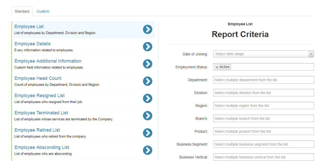 • Reports consist of Employee List,employee details,employee additional information,employee head count,employee resigned list,employee terminated list,age group,employee last login…etc.