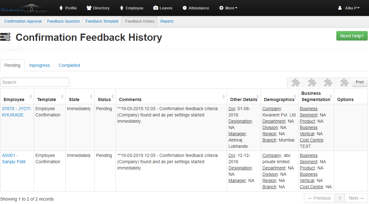 - In feedback history you can see the history of all confirmation feedback history like pending, in-progress and completed.