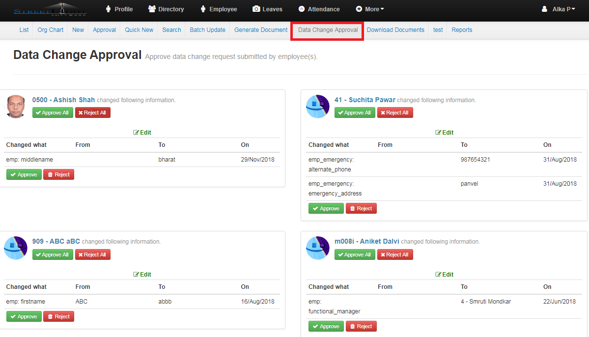 Home / Employee / Employee – Data Change ApprovalEmployee – Data Change Approval 1169 views Less than a minute 0 In data change approval, suppose employee changes his/her name then it will go for approval. You can approve by clicking on Approve button or Approve All button.