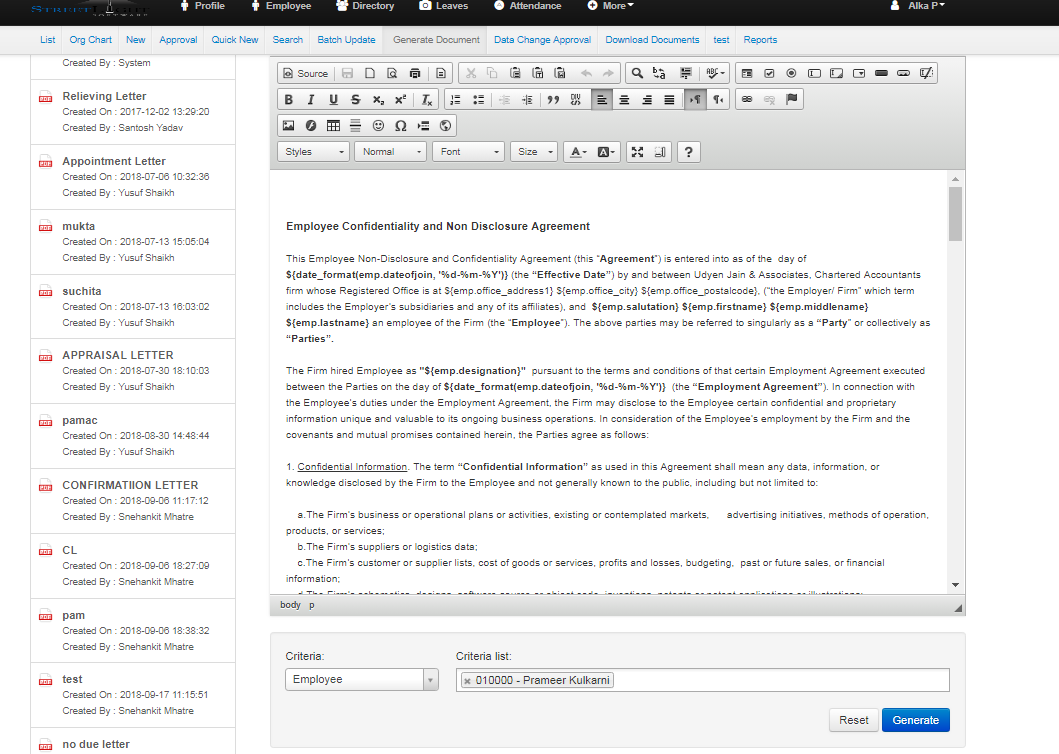 - Generate document tab is used to generate various documents like confirmation letter, experience letter, employee payroll, offer letter..,etc.