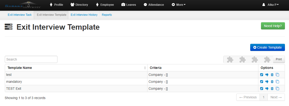 Home / Interview / Exit Interview – Exit Interview TemplateExit Interview – Exit Interview Template 2765 views Less than a minute 4 Click on Exit Interview Template. In this you can see the list of template Template name,criteria and options(Edit,Delete and Copy). To create new template click on create template. Fill the details and save.