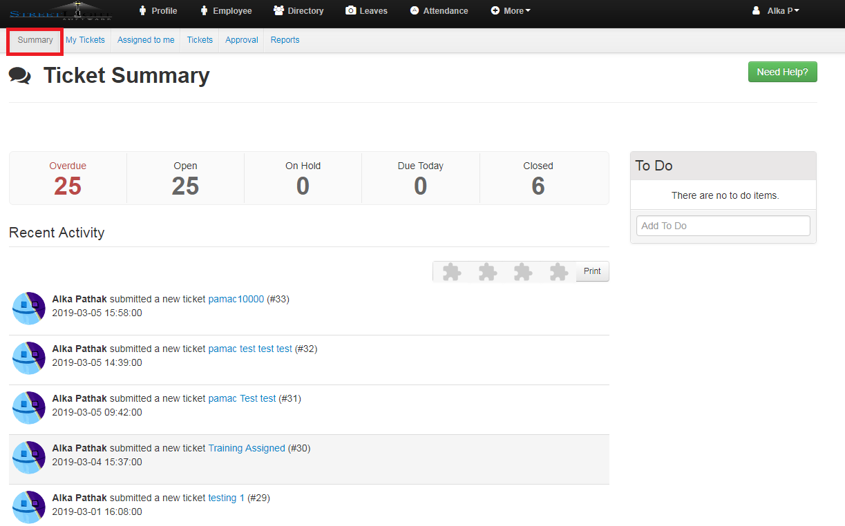 Home / Helpdesk / Helpdesk – SummaryHelpdesk – Summary 1906 views Less than a minute 7 In helpdesk summary, you can see overdue,due today,open,on hold,closed count of all the employee who has ticket. You can click on any of the tabs to get more information. Show the recent activity details of ticket.