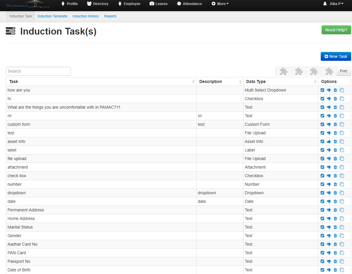 Home / Induction / Induction – Induction TaskInduction – Induction Task 1904 views Less than a minute 7 Click on Induction. Induction Task will be opened. Here you can get the list of task including the field Task,Description,Data Type and Options. To create New Task just click on the New Task Button. And then click on Save button to save.