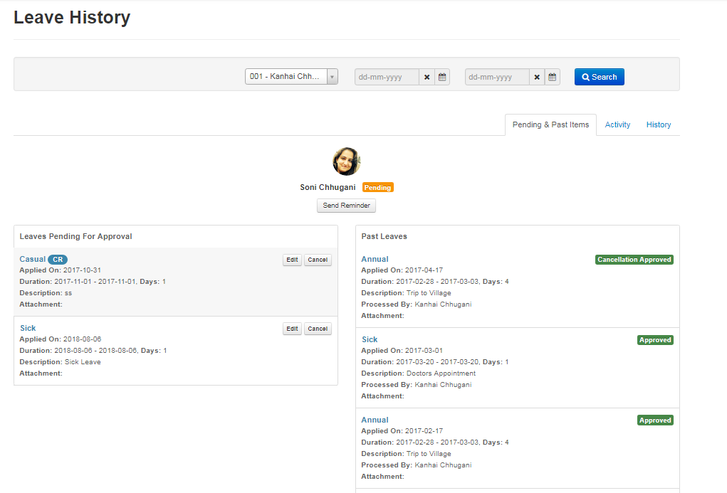 Home / Leaves / Leaves – HistoryLeaves – History 1680 views Less than a minute 3 Here you can view employees leave history such as when employee has applied leave, when it was approved or rejected and by whom. You also have option to select date range.
