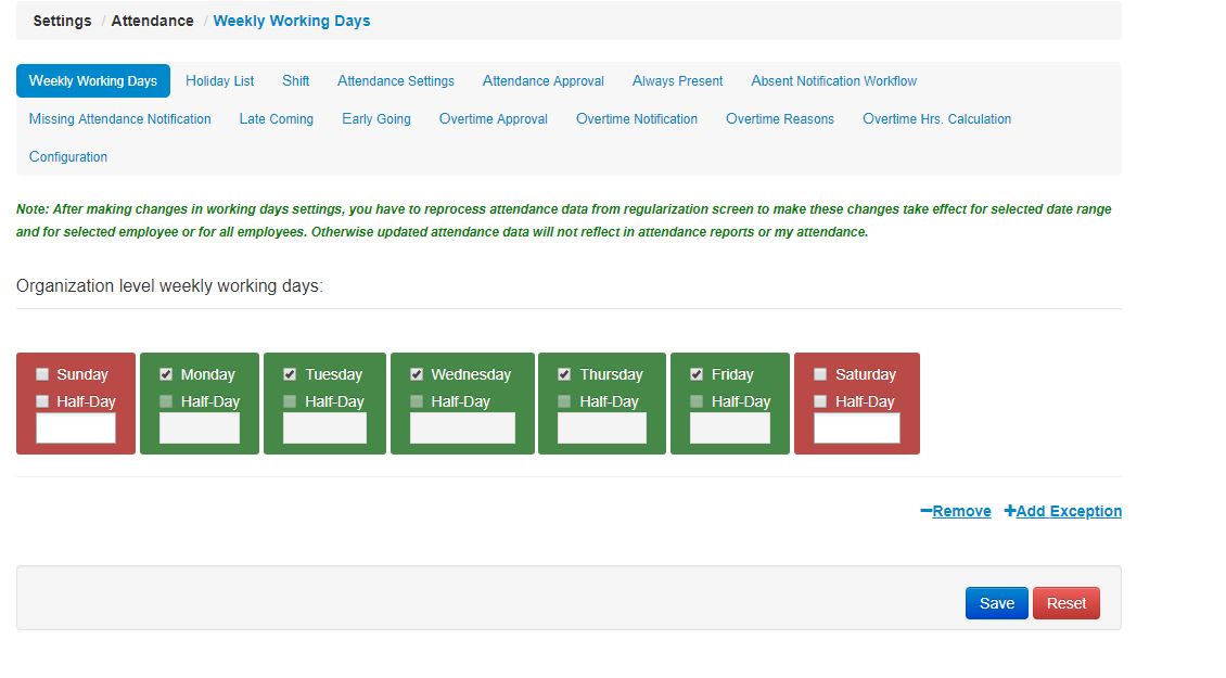 Home / Attendance / Settings /Attendance /Weekly Working Days